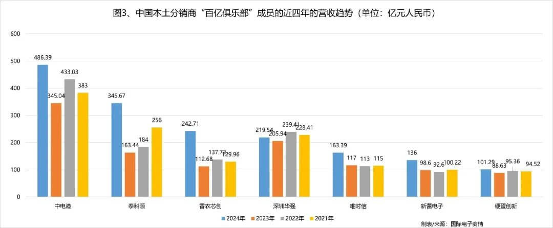 根據(jù)傳統(tǒng),《國際電子商情》將營收超百億元的元器件分銷商劃分為“百億俱樂部”。2024年共有7家中國本土分銷商營收超百億,同比2023年增加2家,中電港、泰科源、香農(nóng)芯創(chuàng)為TOP3。