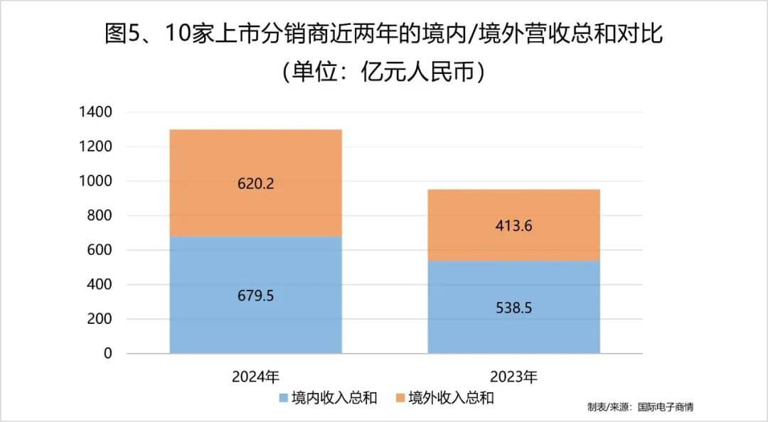 在過去的2024年里,“出?!苯^對是一個(gè)高頻詞。那么,分銷商的出海進(jìn)度如何?我們收集了10家上市分銷商的境內(nèi)外收入數(shù)據(jù),分析可知:境內(nèi)市場仍是主力,但境外市場增長潛力更大。