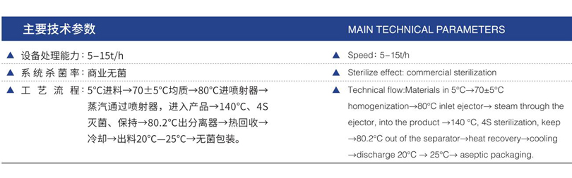 概述:產(chǎn)品先經(jīng)預(yù)熱后,蒸汽直接噴入產(chǎn)品,使產(chǎn)品在瞬時(shí)被加熱到設(shè)定溫度,經(jīng)過(guò)一定時(shí)間的保溫后,通過(guò)真空分離器把產(chǎn)品瞬間降溫,并等量蒸發(fā)掉因蒸汽噴入增加的水分,最后產(chǎn)品在無(wú)菌條件下冷卻、灌裝。