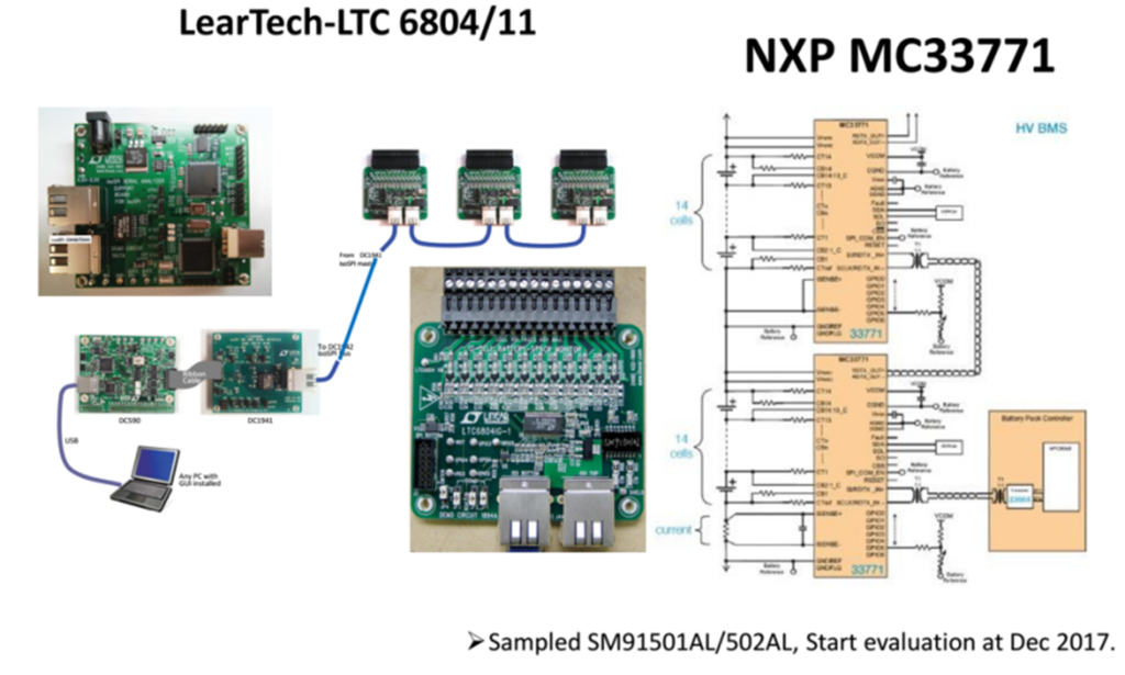 - 分布式包括主板和從板,可能一個電池模組配備一個從板,這樣的設(shè)計缺點是如果電池模組的單體數(shù)量少于12個會造成采樣通道浪費(一般采樣芯片有12個通道),或者2-3個從板采集所有電池模組,這種結(jié)構(gòu)一塊從板中具有多個采樣芯片,優(yōu)點是通道利用率較高,節(jié)省成本,系統(tǒng)配置的靈活性,適應(yīng)不同容量、不同規(guī)格型式的模組和電池包。