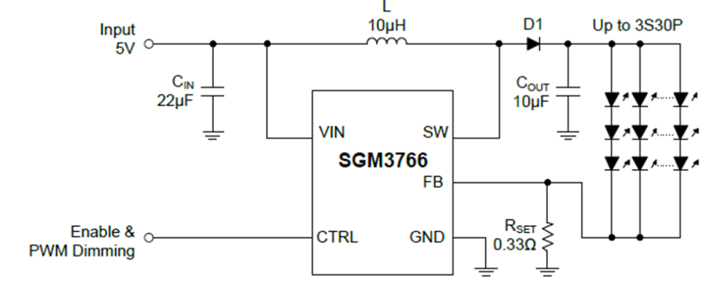 - SGM3766集成40V、2.75A的MOSFET,升壓型LED背光驅(qū)動器,可以驅(qū)動單串或多串并聯(lián)的LED,適用眾多尺寸的面板背光。