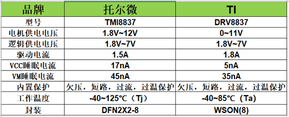 - TMI8837與DRV8837電性能參數(shù)基本一致,只是個別參數(shù)稍有差異;