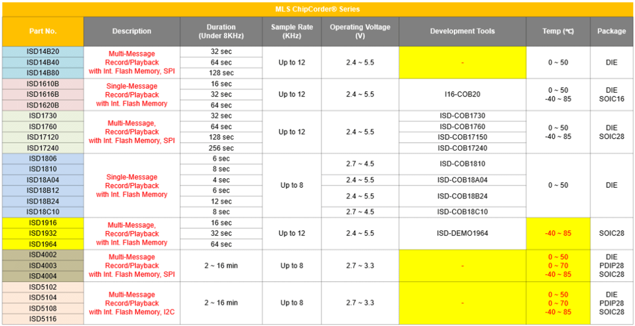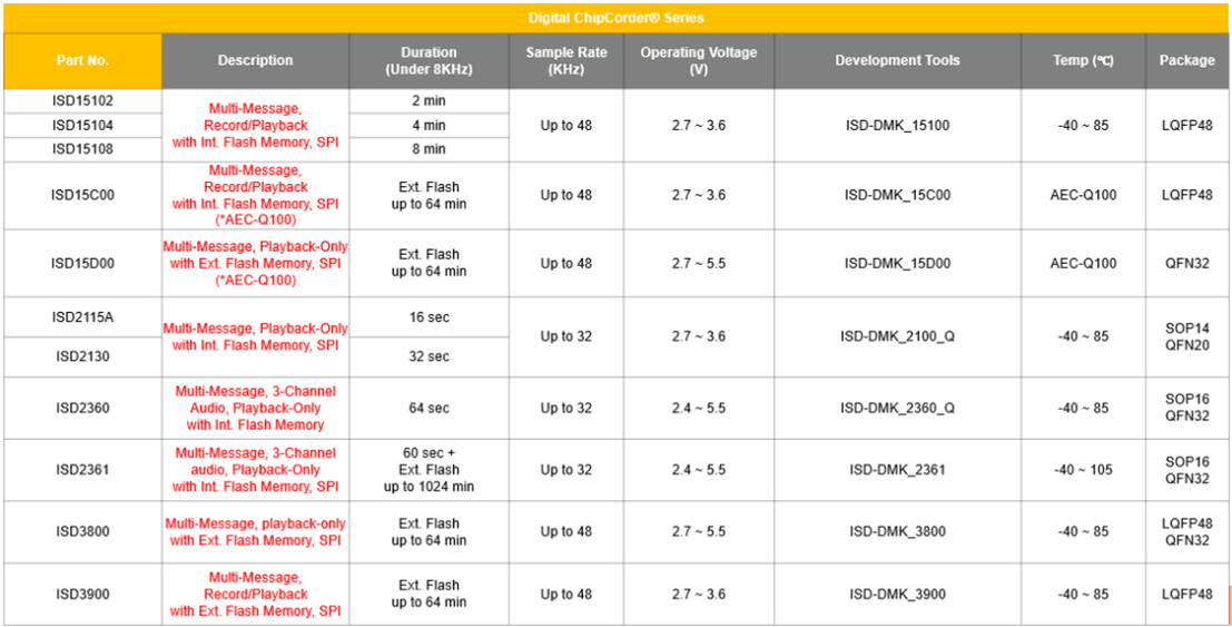在車載應(yīng)用中,新唐科技針特別對(duì)車規(guī)的需求,設(shè)計(jì)符合AEC-Q100車規(guī)級(jí)認(rèn)證的產(chǎn)品ISD15C00和ISD15D00。目前已在知名品牌車企中作為重要的優(yōu)選料號(hào),詳細(xì)的產(chǎn)品選型目錄如下: