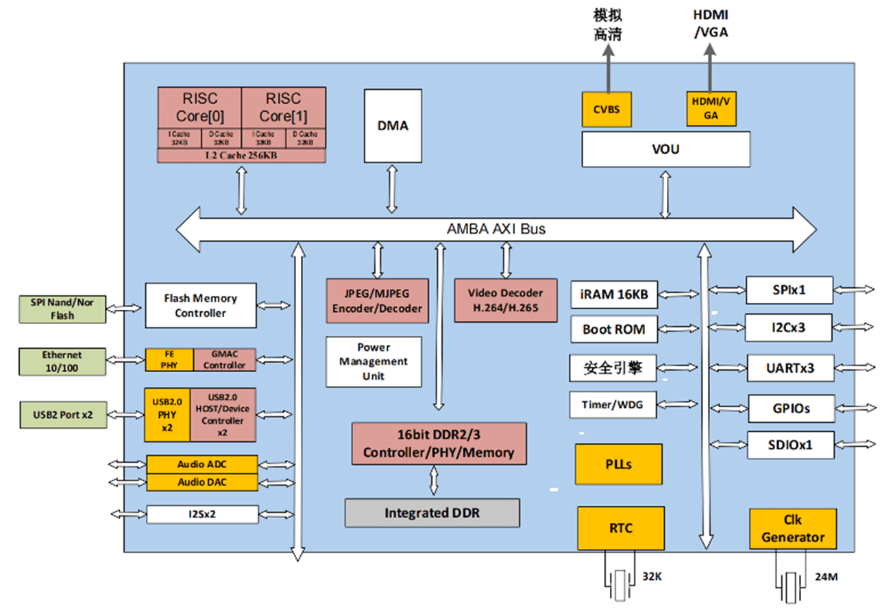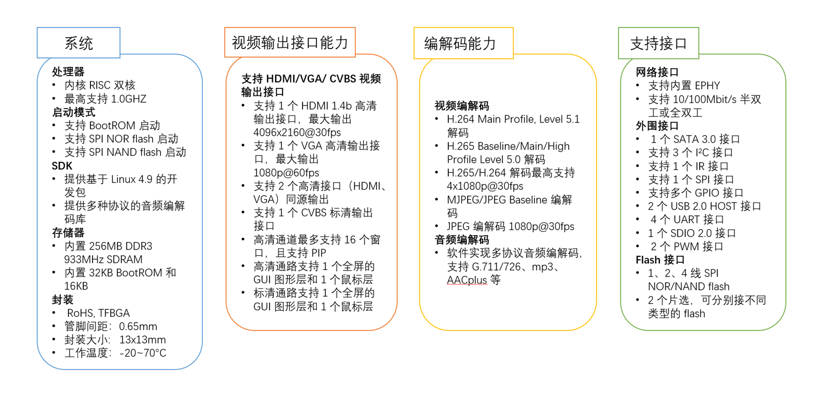 富瀚 MC6810E 采用RISC雙核處理器,最高工作頻率支持1.0GHZ,最大支持 4K30 幀輸出,運(yùn)行Linux系統(tǒng),具備優(yōu)秀的解碼能力和豐富的接口。其主要特點(diǎn)如下: