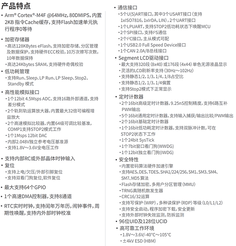 - 行業(yè)領(lǐng)先的低功耗水平,更加低碳環(huán)保。芯片動(dòng)態(tài)運(yùn)行功耗低至60μA/MHz,靜態(tài)功耗低至1.5μA。