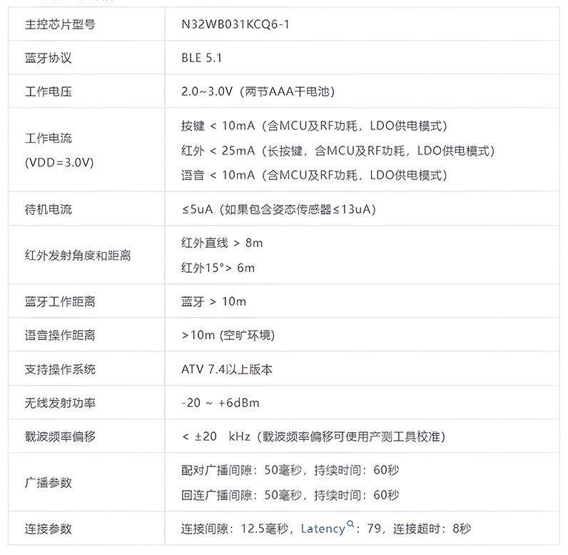 N32WB031系列藍(lán)牙芯片豐富的資源和出色的性能指標(biāo)可滿足藍(lán)牙語(yǔ)音遙控器的各項(xiàng)功能需求,芯片的各項(xiàng)功耗指標(biāo)顯著優(yōu)于其他方案。