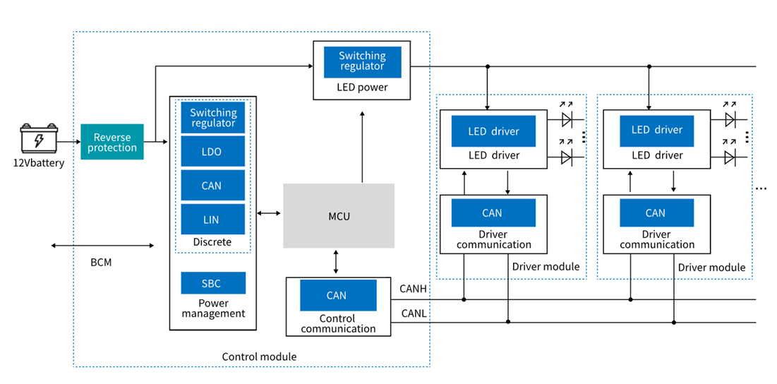 汽車的尾燈由剎車燈、倒車燈、轉(zhuǎn)向燈、霧燈等組成。主要功能是提醒后方車輛,向其傳達(dá)前車的行駛狀態(tài)。 目前主流的尾燈系統(tǒng)基本采用LED照明,一般由MCU+LED驅(qū)動芯片構(gòu)成,各大廠商通過燈光亮度和顏色的變化,實(shí)現(xiàn)不同的燈光效果,提升駕駛體驗(yàn)。