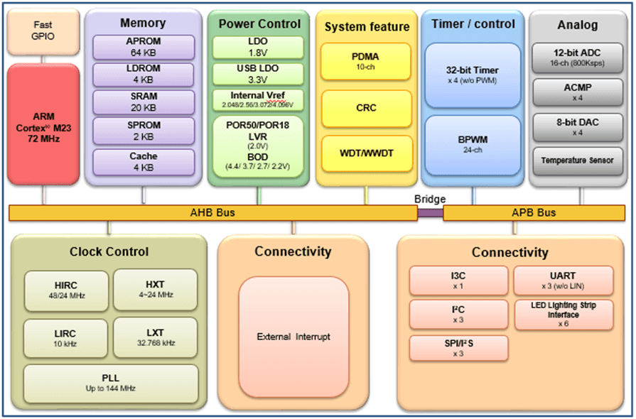 NUC1263系列提供6個信道的LLSI(LED Light Strip interface)接口,此接口可控制RGB燈條以及新一代ARGB Gen 2 燈條,與傳統(tǒng)SPI控制燈條相比只需要用到1/3 不到的SRAM資源,使控制時序燈條軟件開發(fā)者能更有效地利用系統(tǒng)資源,同時降低了軟件開發(fā)的復(fù)雜度。此外,支持高達(dá)24 路高速 PWM 以及9路的50mA強(qiáng)灌電流( High sink current)腳位。除了核心電壓,該系列另外提供兩組電源IO,可分別工作在不同的電壓范圍,使其更能適應(yīng)外部設(shè)備的不同電壓標(biāo)準(zhǔn),并更具彈性且無縫地集成到各種應(yīng)用中。本系列提供高達(dá)3組 UART、3組 I2C、3組 SPI/I2S、2組 I3C,更配備了高性能模擬功能,包括 16 路 12 位800 kSPS ADC、4路 8 位 200 kSPS DAC 和仿真比較器(ACMP)。