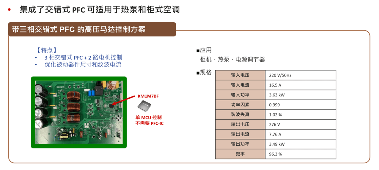 針對(duì)家用空調(diào)和熱泵市場(chǎng)的應(yīng)用推出了全新的M4系列內(nèi)核產(chǎn)品,實(shí)現(xiàn)了單MCU 控制雙電機(jī)+高頻PFC的解決方案。