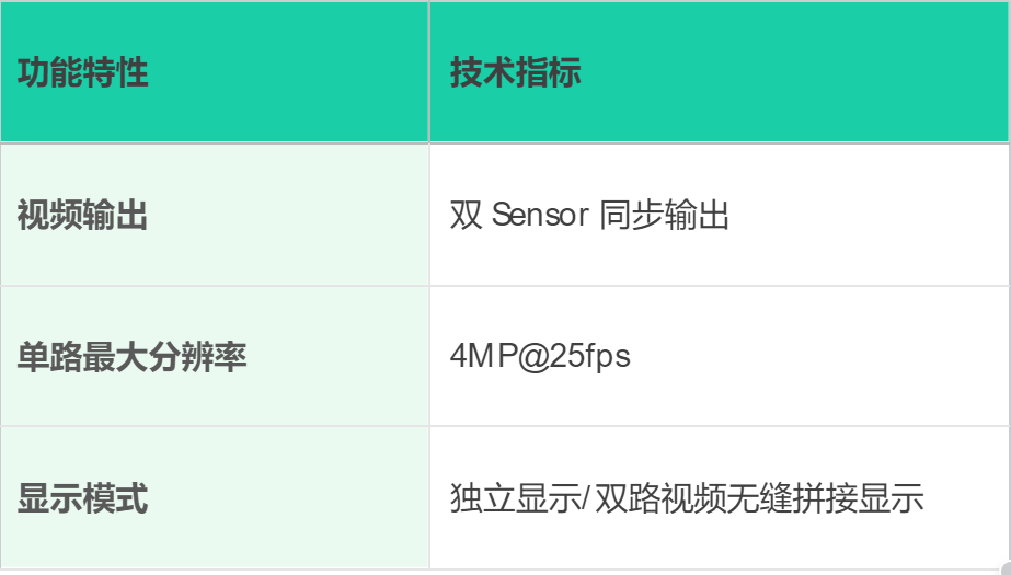支持兩路不同Sensor同步輸出,雙路畫面獨立顯示或拼接顯示,同時可拼接兩路視頻輸出,實現(xiàn)更大視場角畫面。為當(dāng)前市場主流兩路Sensor輸出產(chǎn)品提供SoC解決方案。