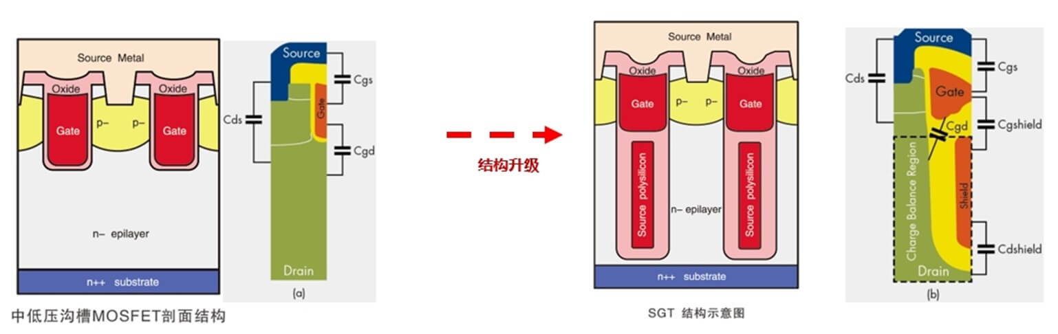 通過在柵極溝槽底部,引入屏蔽柵多晶硅場板,將絕大部分的Cgd轉(zhuǎn)化為了小值的Cgs,顯著地降低了米勒電容Cgd,加快了開關速度。