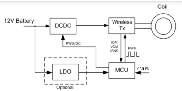 車載手機(jī)無線充電的原理框圖如圖所示,由一顆寬電壓輸入的DCDC,一顆無充電發(fā)射(集成POWer Stage),一顆通用MCU和一顆高壓LDO組成。無線充電發(fā)射端將IDMNDMISNS信號送給MCU.MCU根據(jù)設(shè)備端所重功率,一方面通過PWM或者12C調(diào)節(jié)DCDC的電壓,一方面調(diào)節(jié)發(fā)射端內(nèi)部Power Stage的工作占空比,從而調(diào)節(jié)發(fā)射端的輸出功率。這里L(fēng)DO用來給MCU供電,是optiona選項(xiàng),也可由無線充電發(fā)射端內(nèi)部集成的buck來實(shí)現(xiàn)。