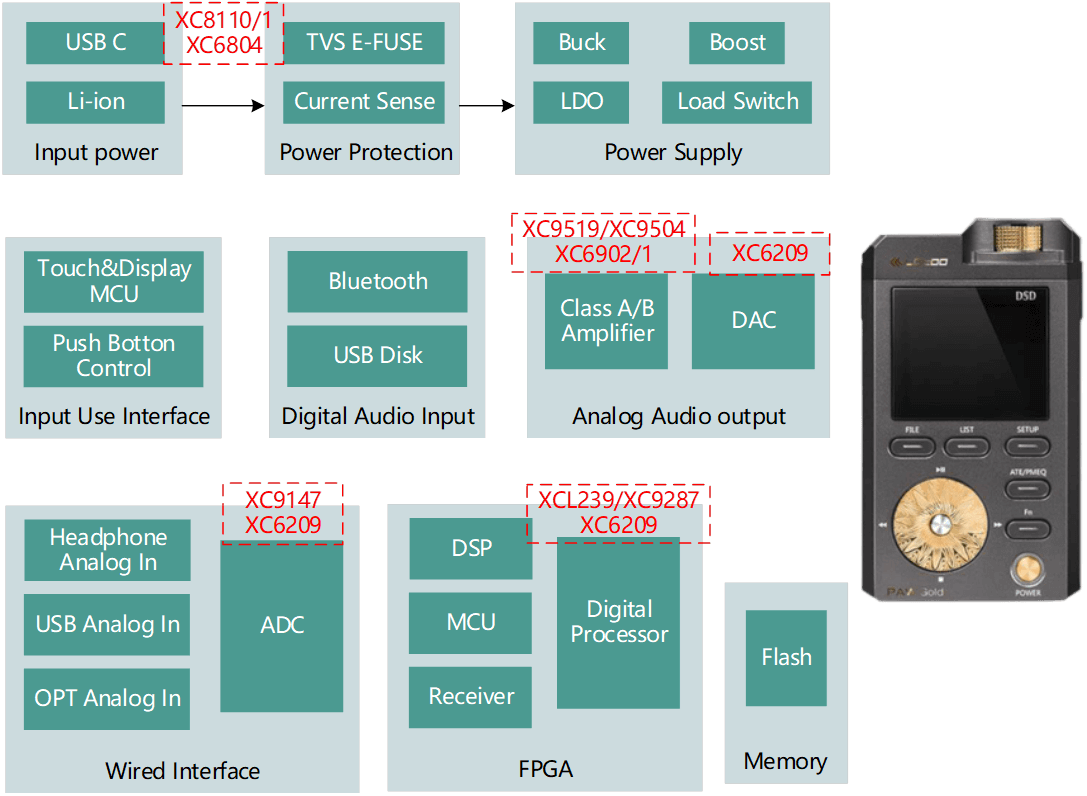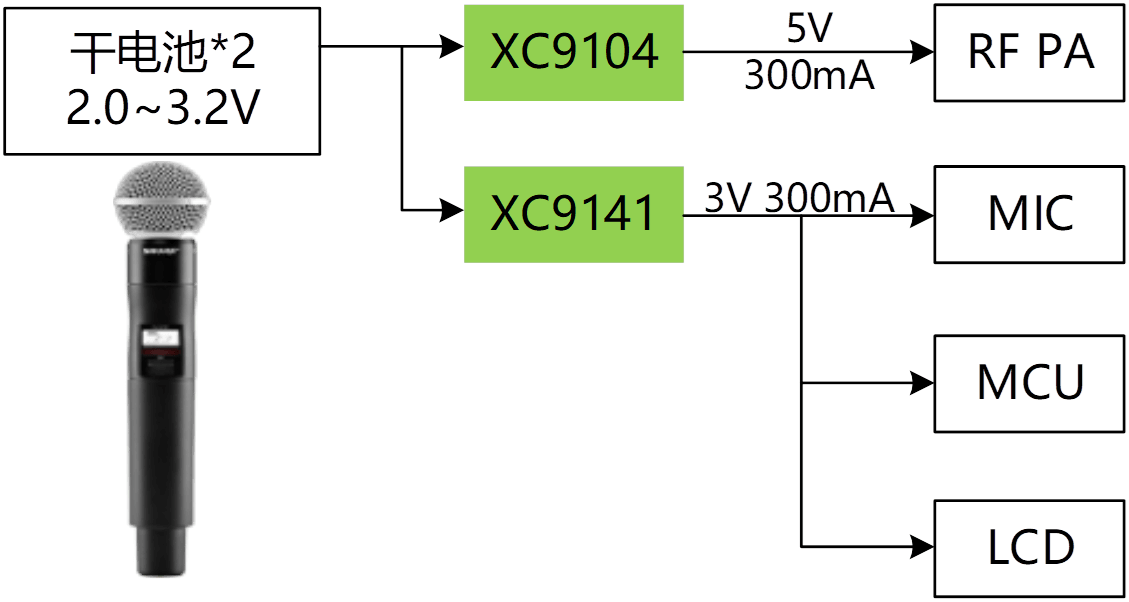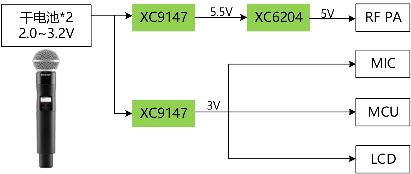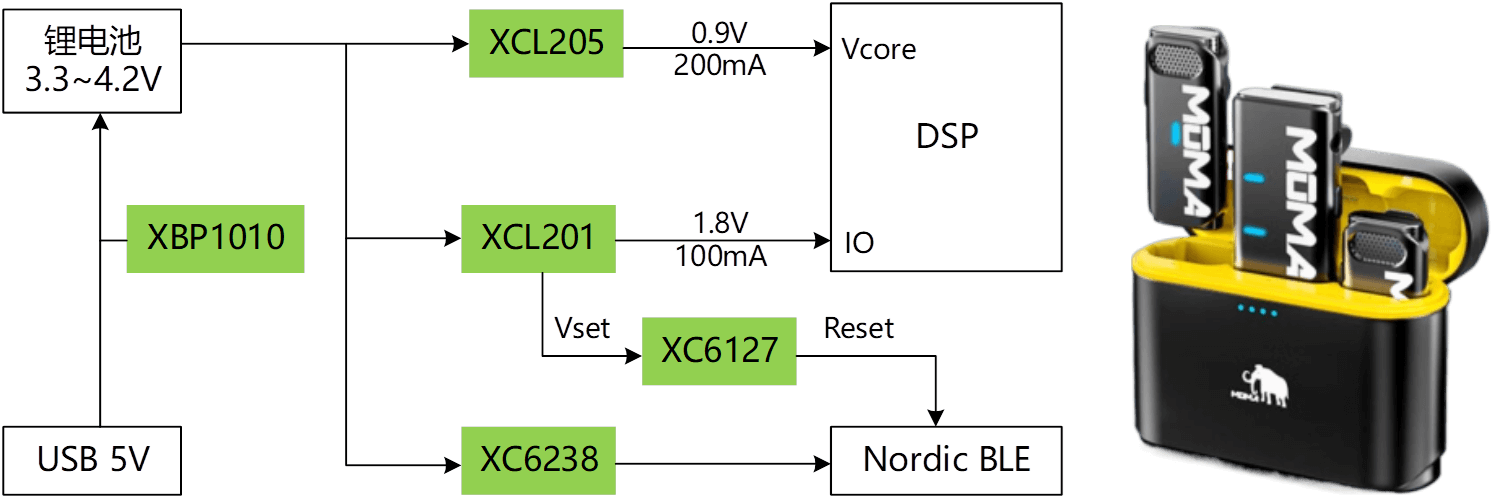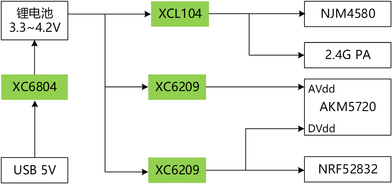 - 音頻功放供電及射頻PA供電,XC9147/1,XC9104升壓DCDC,優(yōu)秀電源紋波;高精度,低噪聲LDO XC6209/4,進(jìn)一步提升電源表現(xiàn)