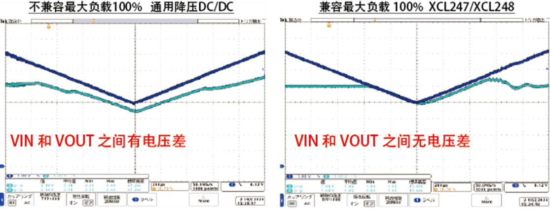 XCL247/XCL248系列采用的是P溝道驅(qū)動(dòng)FET,替代高壓DC/DC轉(zhuǎn)換器中常用的N溝道驅(qū)動(dòng)FET,實(shí)現(xiàn)了100%占空比對(duì)應(yīng)。即使在輸入電壓低于輸出電壓設(shè)定值時(shí),仍可直接導(dǎo)通輸入電壓進(jìn)行輸出。這使得在輸入輸出電壓差較小的工況下也能安心使用(圖4)。此外,通過搭載提示輸出電壓穩(wěn)定狀態(tài)的PowerGood功能與啟動(dòng)時(shí)軟啟動(dòng)功能,可滿足工業(yè)設(shè)備對(duì)后級(jí)負(fù)載系統(tǒng)電源時(shí)序控制的高要求。