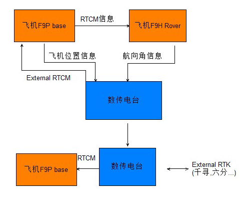 工作原理以及信號流程:飛機上的F9P base接入RTK信號,與飛機上F9H(rover)構成moving-base系統(tǒng),可以知道飛機的精確位置和航向角。但是有一個要求是base和rover的安裝距離需要大于30cm;數(shù)傳電臺需要把F9P base和F9H的2個串口信號合并到一起,傳回汽車端,這里面包含飛機位置信息,航向角信息以及RTCM信息;汽車上安裝F9P,接收數(shù)傳電臺的RTCM信號,這樣構成一個單RTK系統(tǒng),可以實時知道汽車和飛機的位置信息。