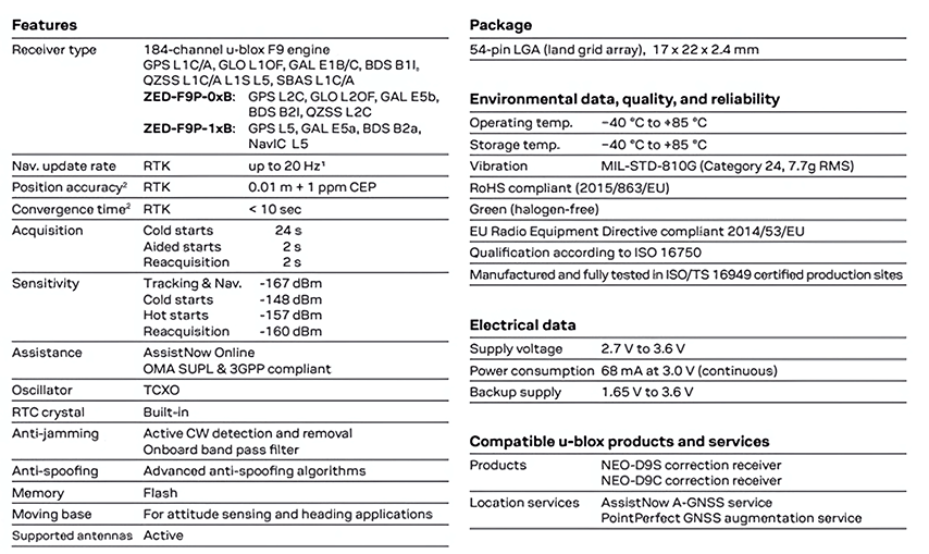 特點:ublox公司作為全球領先的定位與無線通信技術供應商,結合自身綜合實力與采用最新推出的u-blox F9平臺的技術,核心創(chuàng)新研發(fā)出可在數(shù)秒內提供穩(wěn)定的高精度定位產(chǎn)品ZED-F9P。