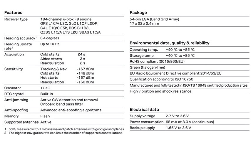 ZED-F9H作為附帶模塊,要求在同一設備上安裝ZED-F9P模塊。在該裝置中,ZED-F9P提供精確的GNSS位置,同時作為ZED-F9H模塊的移動基座,ZED-F9H模塊輸出精確的姿態(tài)信息。由于航向信息是基于全球導航衛(wèi)星系統(tǒng)的,因此不需要預先校準,從而確保易于生產(chǎn)、集成和操作。精確的航向信息總是可用的,即使在靜止的情況下。ZED-F9H設計用于降低標題應用程序的系統(tǒng)成本,并具有最小的電子BOM。由于其體積小,重量輕,功耗低,非常適合大眾市場的采用。